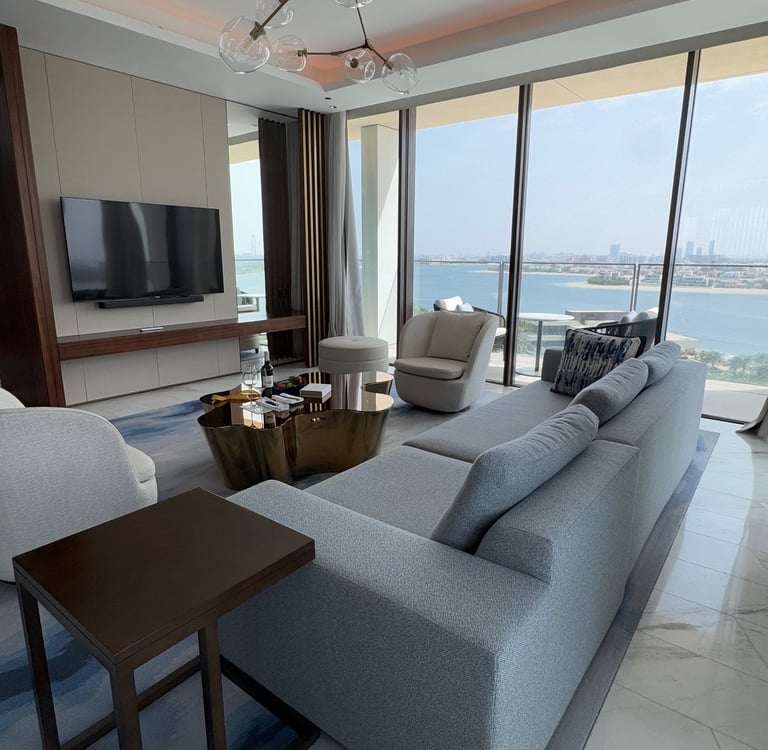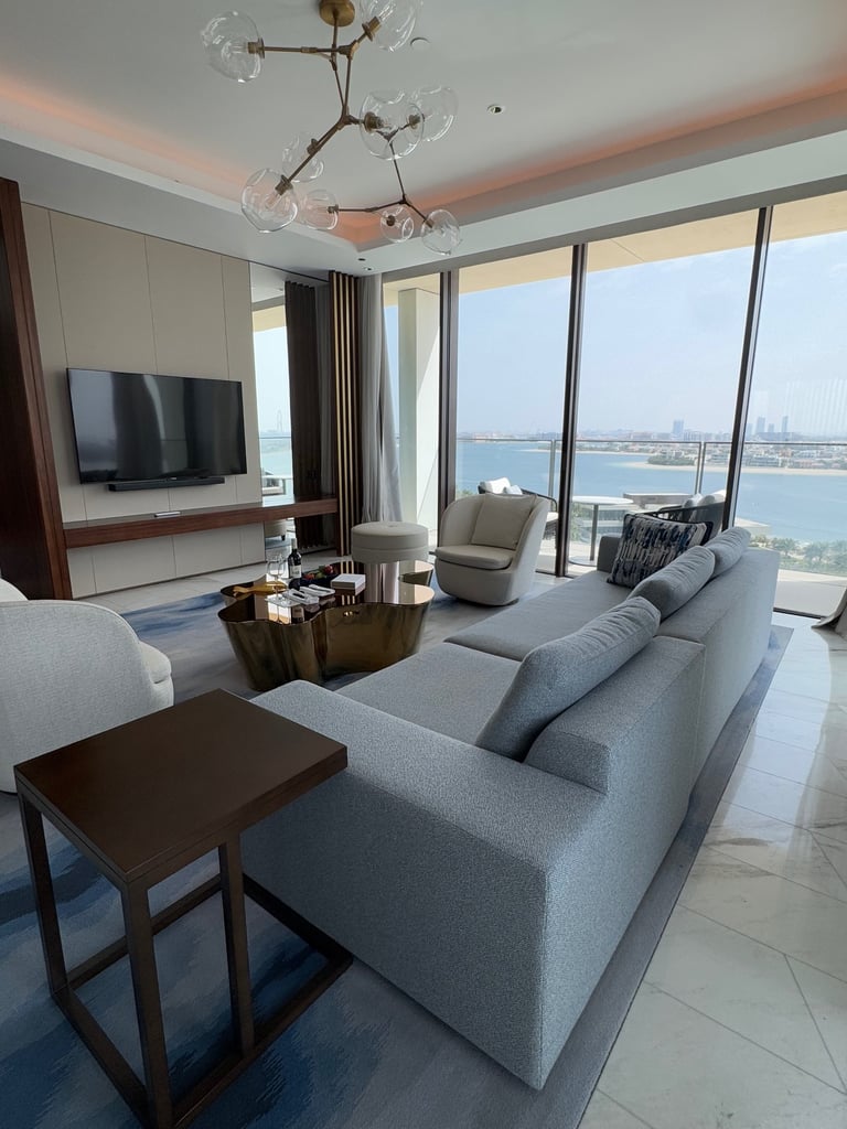 As you take in your surroundings, anticipation builds for the big reveal—the moment you step into your room and witness firsthand what even the most breathtaking hotel photos couldn’t fully capture. My experience led me to hear words that felt like gold: “We are upgrading your room three tiers higher.” With excitement amplified and curiosity piqued, we cheerfully followed our escort to the elevator. When we arrived at our door, key card in hand, we swiped it open—and our jaws dropped. Before us stretched an almost 360-degree view of The Palm. In that instant, one thought struck me: We made a huge mistake—we should have booked a longer trip. Every detail of the room was meticulously designed, each element building upon the other, culminating in the crescendo of The Royal luxury.